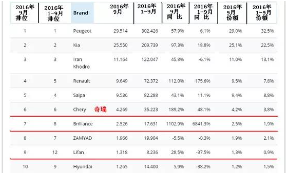 伊朗车市今年前九个月销量榜前十位品牌车中,三大自主车企上榜,分别是奇瑞、华晨和力帆。