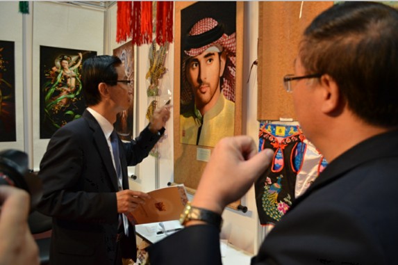 大使对我们一家企业的刺绣产品很感兴趣,我们企业绣出来的迪拜王储头像惟妙惟肖,非常的精美,而且这次产品还可以批量生产,阿拉伯人会比较喜欢。