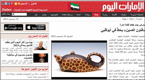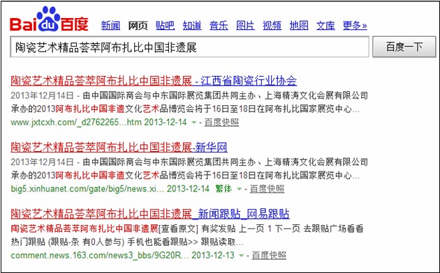 (1)新华社11月14日电“陶瓷艺术精品荟萃阿布扎比中国非遗展”,网址:http://news.xinhuanet.com/overseas/2013-12/14/c_118555326.htm。在新华社报道后,国内几乎所有的相关主流媒体都进行了转载报道,网易和新浪还上到了版块的首页。