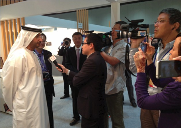 阿联酋外贸部部长阿卜杜拉•萨利赫出席了我们展会的开幕仪式并巡馆,他接受了中央电视台和阿通社等媒体记者的视频采访。