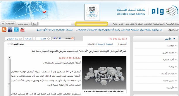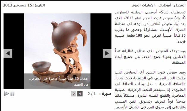 (2)阿通社11月14日电“شركة أبوظبي الوطنية للمعارض "أدنيك" تستضيف معرض الفنون الصيني بعد غد”(中文:后日将在阿布扎比国际展览中心举办中国文化艺术品展和消费品展),网址:http://www.wam.ae/servlet/Satellite?c=WamLocAnews&cid=1290007808839&pagename=WAM%2FWAM_A_Layout&parent=Collection&parentid=1135099399933