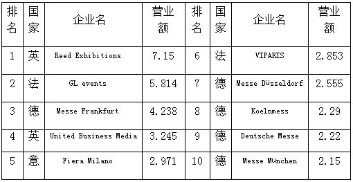 在全世界影响较大的210个专业性国际展览会中,有150多个在德国;在世界会展营业额最多的10大展览公司中,有6个在德国;在世界最大的5个展览场地中,有4个在德国。据2010年AUMA(德国贸易展览业协会)统计数据,德国会展业年营业额超过23亿欧元,净展出面积超过700万平方米,吸引近175000家参展商(其中54%来自国外),超过1000万参观者,其中近250万来自国外。