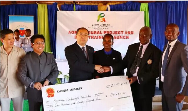 2015年10月22日,中国驻博茨瓦纳大使郑竹强出席“中非民间友好行动”青年农业项目启动仪式。博教育与技能发展部长尤尼蒂·道、博华人慈善基金会副会长牟鸿儒、博青年培训营协会负责人、莫楚迪地区传统部落酋长等50余人出席仪式。