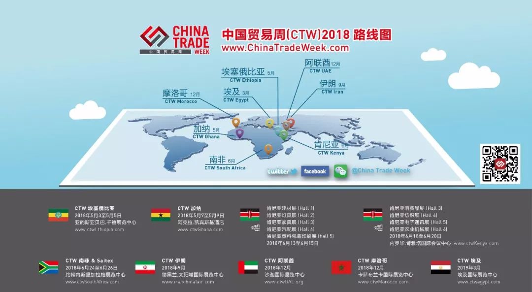 2017年6月29日,第三届"肯尼亚中国贸易周 CTW KENYA 2017",在肯尼亚国际展览中心KCC隆重开幕。来自江苏、浙江、福建、陕西、山东、河北、天津、广东等省市的450多家企业参展,展出面积近1万平方米。3天展会接待了16,500多名关注,第三届肯尼亚中国贸易周,也被称为非洲的广交会。