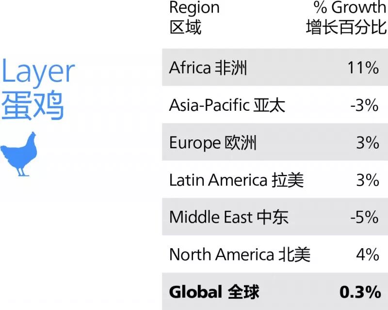 (3)蛋鸡饲料:2017年蛋鸡饲料比较稳定,同比只有0.3%的增长,其中只有非洲增长幅度较大(11%),而且非洲也是饲养蛋鸡最昂贵的地区。