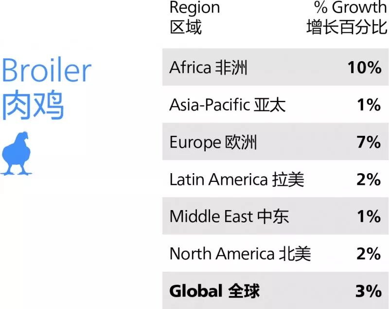 (2)肉鸡饲料:2017年全球肉鸡饲料增长3%,非洲增长最为强劲(10%),其次是欧洲(7%)。非洲的增长主要来自埃及、乌干达和莫桑比克。