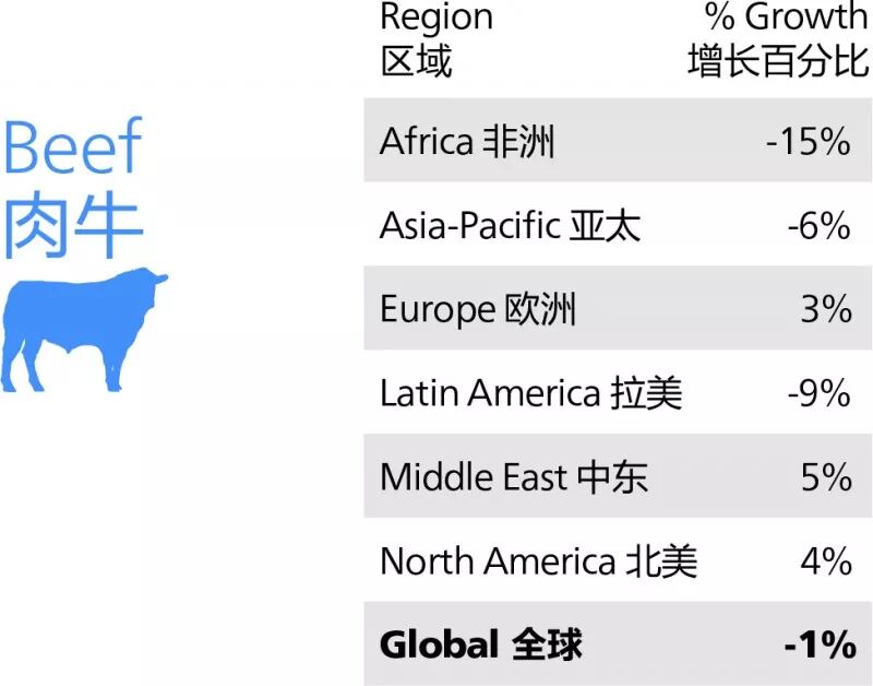 (4)肉牛饲料:2017年肉牛饲料是唯一一个品种呈下降的饲料,降幅为1%,其中非洲(-15%)和拉美(-9%)领跌。