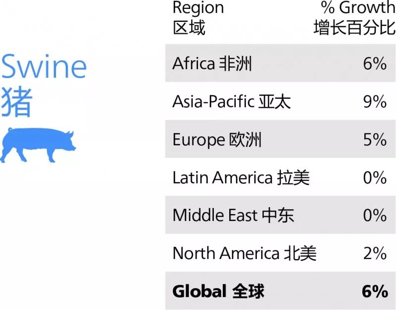 (1)猪饲料:2017年全球猪料增长6%,亚太地区增长最多(9%),其次是非洲(6%)。
