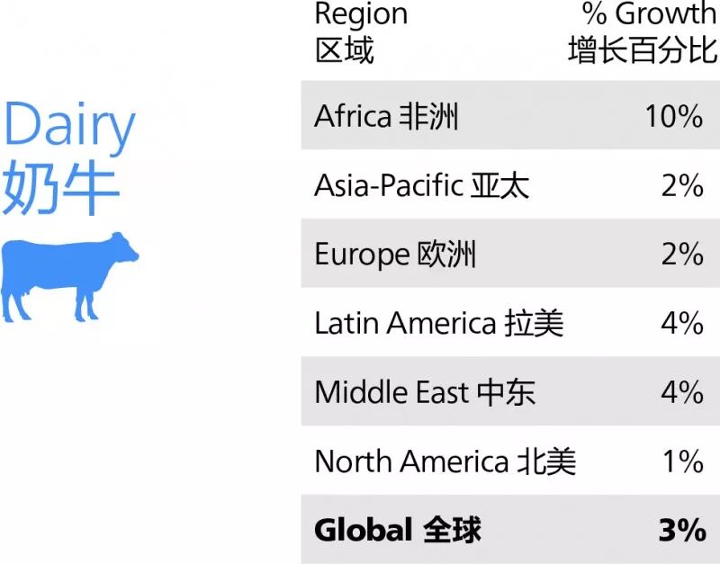 (5)奶牛饲料:2017年奶牛饲料增长3%,非洲涨幅最大(10%),但欧洲是乳制品生产的全球领导者,平均增长2%。
