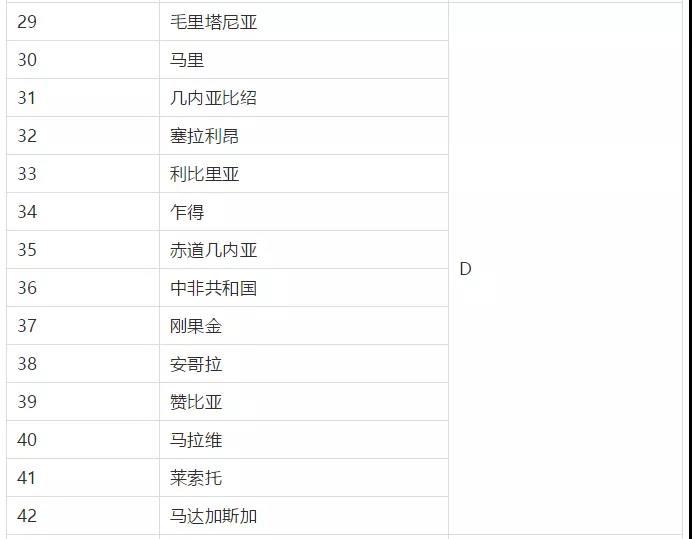 以毛里塔尼亚、马里、几内亚比绍等为代表的14个非洲国家的外贸信用等级为D级;