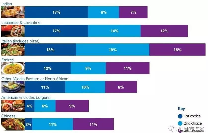 根据毕马威会计师事务所(KPMG)发布的2017年阿联酋餐饮业报告,81%的受访者表示2017年外出就餐次数多于2016年。从阿联酋消费者喜好来看,印度和黎巴嫩餐厅最受欢迎。而中餐作为首选外食餐厅的比例仅为3%。