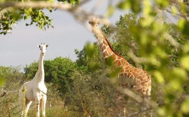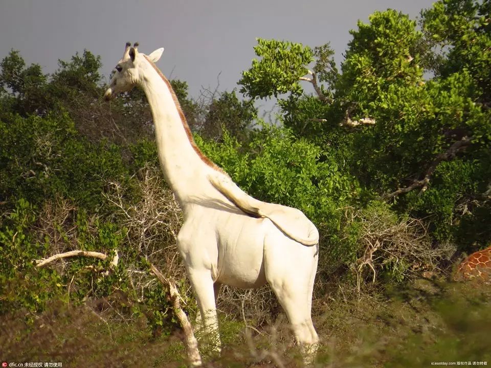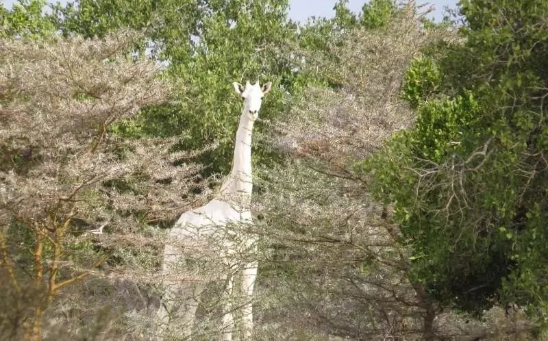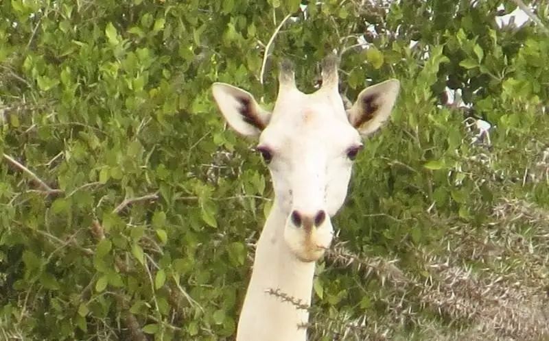 当地时间2016年4月22日报道(具体拍摄时间不详),近日,肯尼亚Ishaqbini野生动物园出现一头罕见的成年“纯白长颈鹿”。如果不是它标 志性的长脖子,你根本无法辨别它竟是一头长颈鹿。