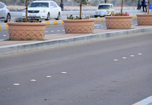 至于为什么用这种白瓷铆钉做分道线标志,原因有多种说法:其一,白瓷铆钉表面光滑不留尘土,在这沙漠地区的特大沙尘暴环境中,也能保证交通的顺畅;其二:白瓷铆钉凸出于路面,如果压到会有感觉,也能起到很好的警示作用;其三:有钱任性呗,美观富有奢华的象征,尽管经常会有被压裂的现象也不在乎。