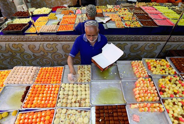 一位卖甜食,甜点的商贩。 也是在迪拜的菜场