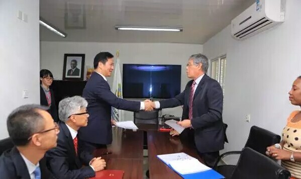 中信建设副总经理、非洲区事业部总经理刘桂根(左)与安方签订协议。新华社发(张国庆摄)