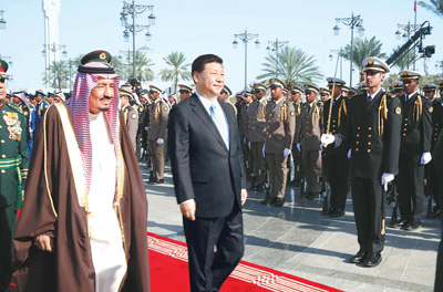 当地时间1月19日,习近平出席萨勒曼国王举行的隆重欢迎仪式。新华社 鞠鹏摄