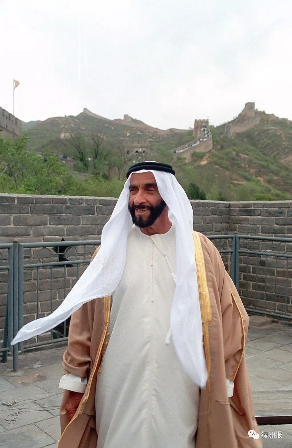 我第一次见到扎耶德总统是1989年12月24日,杨尚昆主席访问阿联酋的时候。当时,我任外交部西亚北非司副司长,作为记录,参加了杨主席同扎耶德总统的会谈。原定那日上午10时,两位元首举行会谈。杨主席正待出发,陪团的外交部礼宾司长江康来报告说,据阿联酋总统典礼局长告,扎耶德总统找不到了。据说,他一大早骑马去了郊区,至今未归,谁也不知道他去什么地方。对方一再表示歉意。杨主席听后,笑了笑说,没关系,客随主便。我们就等吧!我们私下开玩笑说,看来,这只沙谟雄鹰不知飞到哪里去了。大家不由哈哈大笑。就这样,会谈推迟了整整1小时。11时,杨主席同扎耶德总统出现在接见大厅。我看到扎耶德高个宽肩,长脸,留着络腮八字胡,气度庄严,双目炯炯有神,身着白长袍,头戴黑头扎和白头巾,外披土黄色镶金边的外罩衫。他微笑着同杨主席握手。接着,两位元首互赠礼品。杨主席赠中国造双筒新式猎枪,扎耶德回赠一把镀金宝剑。