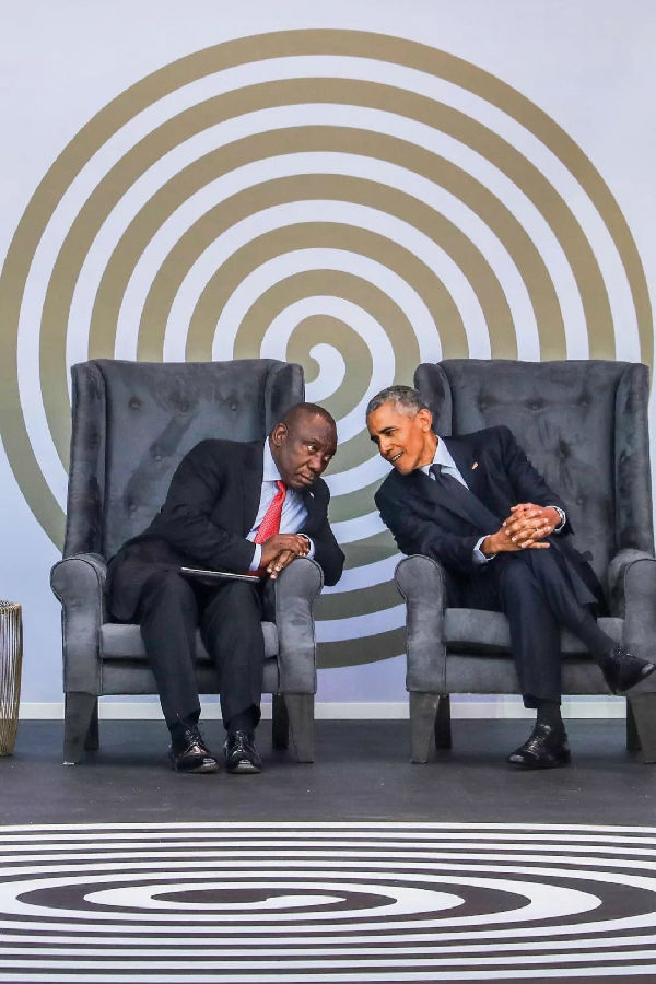 7月17日,在约翰内斯堡的流浪者板球体育场,南非总统拉马福萨(左)和美国前总统奥巴马(右)出席2018年曼德拉年度讲座。