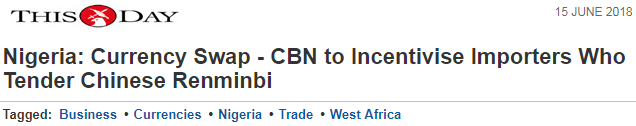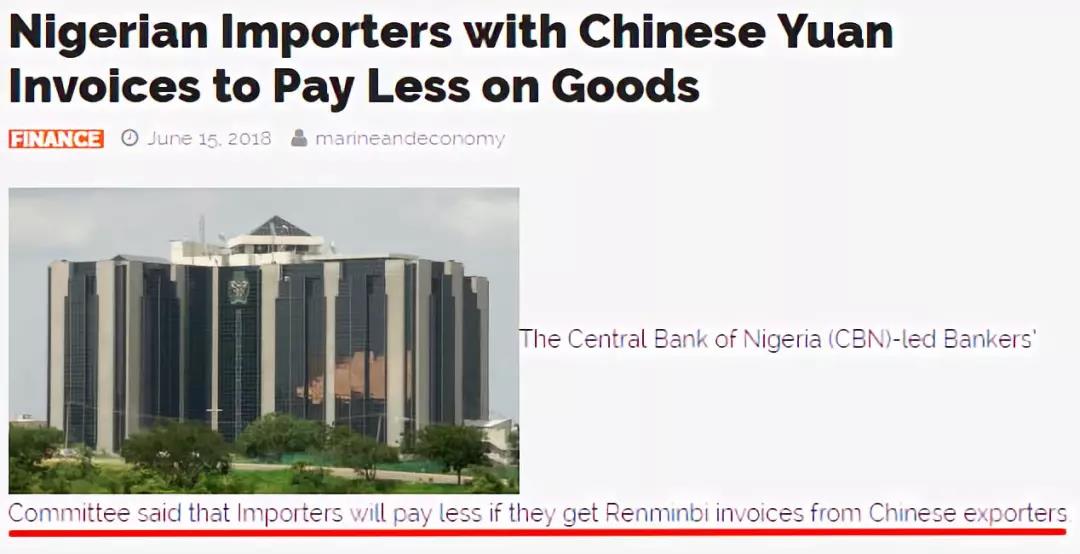 然后最近,尼日利亚央行宣布,在中尼两国150亿元人民币/7200亿奈拉的货币互换协议基础上,正式批准本国进口商在进口中国机械设备等商品时,使用人民币而非美元进行结算。这将有利于尼稳定目前的外汇储备水平,缓解外汇供应压力。尼日利亚Stanbic IBTC银行负责人表示,为鼓励进口商用人民币取代美元进行交易,银行推出相应的优惠政策,比如对以人民币结算的进口商在购汇时提供一定幅度的优惠,从而为进口商降低交易成本。