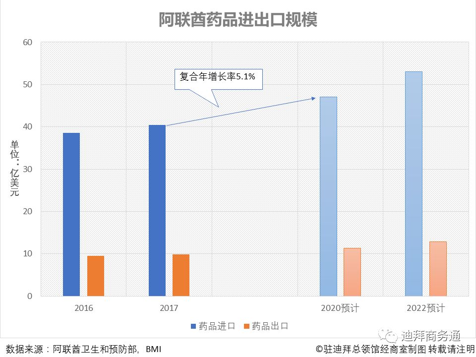 阿联酋卫生部数据显示,2017年阿联酋药品进口额达148.1亿迪拉姆(约合40.4亿美元)。BMI预计,到2020年之前,这一数字将以5.1%的复合年增长率增长至173亿迪拉姆(约合47.1亿美元)。