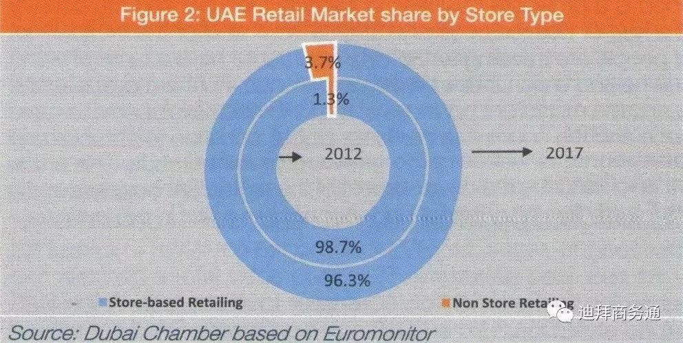 过去五年中,网上零售以23%的年复合增长率高速增长。业内人士认为,阿联酋无店铺零售在过去几年和未来的大幅增长主要得益于阿联酋互联网零售业领域的重大变化,例如,亚马逊收购地区领先的电商平台souq.com,以此打入了本地区快速变化的电子商务市场,而伊玛尔集团(Emaar)联合来自沙特、科威特等的资本,于2017年10月正式开通了电商平台noon.com,也为阿联酋线上销售市场注入了新的活力。