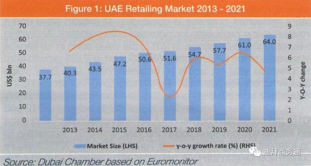 尽管人口总数不到1000万(世界银行数据2016年为927万),阿联酋仍成为中东地区仅次于沙特的第二大零售业市场,这主要归功于其较高的国内人均收入和城市化水平,以及消费者对便利化和健康产品需求意识的逐渐提高。然而,近年来国际油价下跌、全球贸易需求放缓和消费者信心低迷等因素对阿联酋的零售业也产生了一定的负面影响,而今年1月份开始征收的增值税也影响着消费者支出。