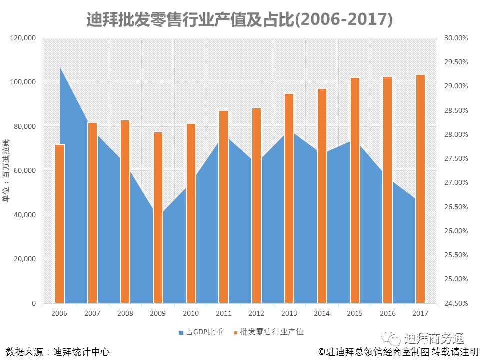 于迪拜而言,批发零售业更是长期在其GDP中占比1/4以上,遥遥领先于其他经济部门,牢牢占据第一的位置。