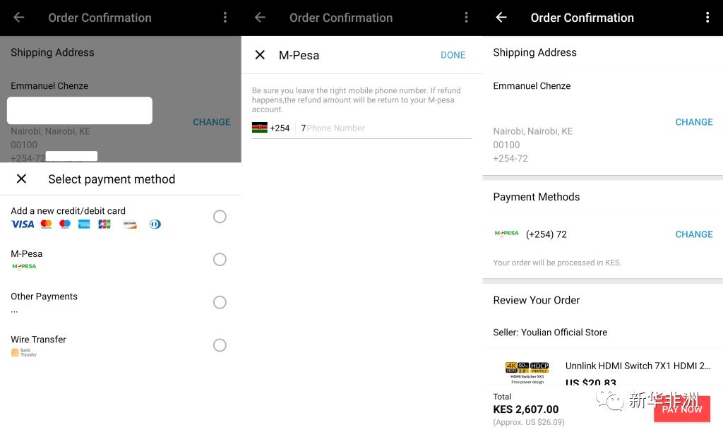 使用M-pesa在阿里巴巴速卖通平台支付操作截图。(图片源于网络)
