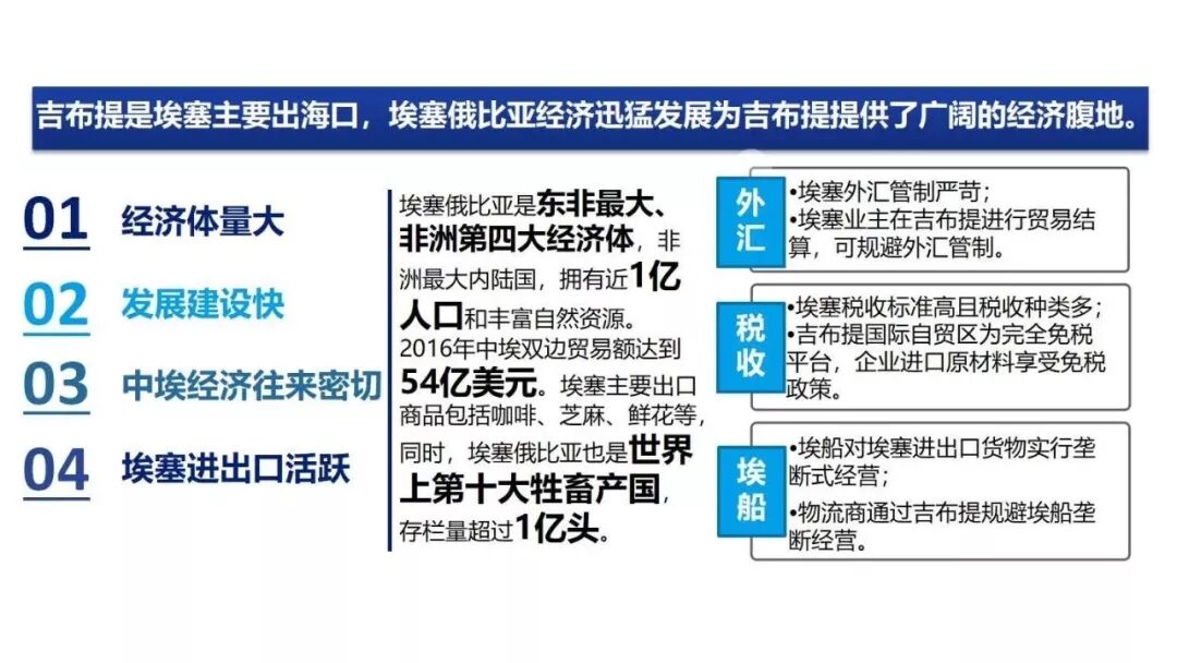 吉布提位于非洲东北部亚丁湾西岸,作为东非地区的桥头堡,在中国政府“一带一路”关键结点上,是实现“海上丝绸之路”跨国生产要素整合的重要一环。