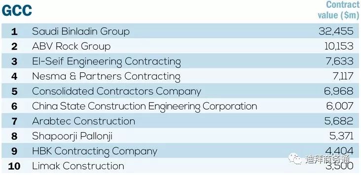 (图:海合会市场按在施项目合同额排名前十大承包商;图片来源:MEED)