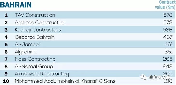 (图:巴林市场按在施项目合同额排名前十大承包商;图片来源:MEED)