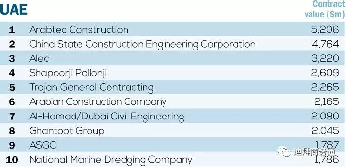 (图:阿联酋市场按在施项目合同额排名前十大承包商;图片来源:MEED)