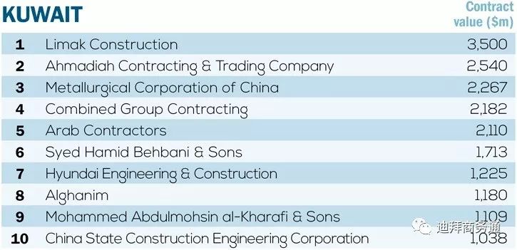 尽管科威特市场上本土承包商仍占据主导,但长期以来科威特最大的承包商Mohammed Abdulmohsin al-Kharafi公司的影响力在逐渐衰退,今年该公司在科威特前十大承包商排行榜上的位置下滑到第9位。