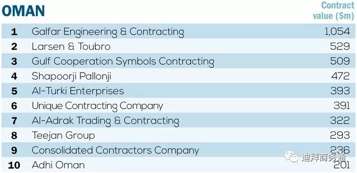 (图:阿曼市场按在施项目合同额排名前十大承包商;图片来源:MEED)