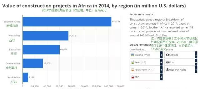 2019年,非洲建设项目分布情况,南部非洲占比最大,相应的建材市场需求量也最大。据报告,2019年南部非洲共有119项建设项目,总价值约1450亿美元;北部非洲占比最小,约91.16亿美元。
