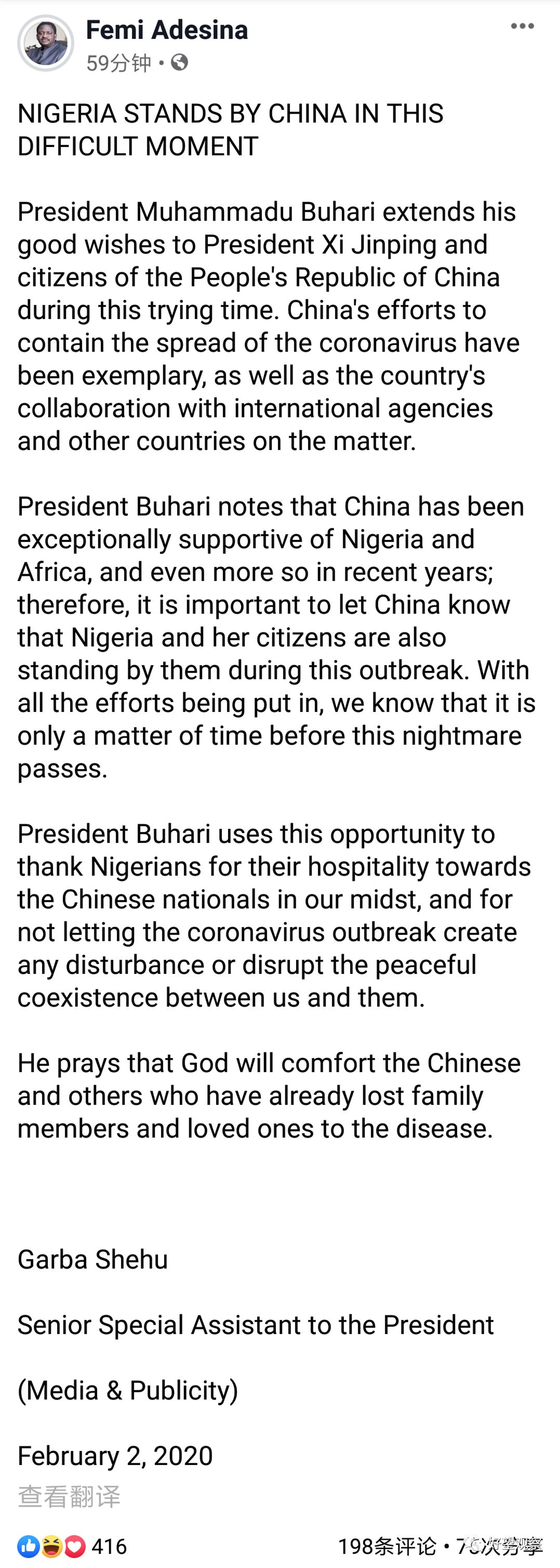 据报道,布哈里总统也就冠状病毒疫情致信中国。布哈里表示尼日利亚与中国站在一起,向习近平主席和中国人民致以良好祝愿。2020年2月2日,布哈里总统并通过个人社交媒体账户向中国政府和人民防控疫情的模范行动致以敬意。