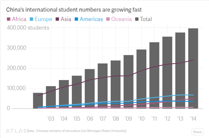 2006年,中国表示,将在3年内将中国政府向非洲学生提供的奖学金从每年2000个名额增加到每年4000个名额。中国正在坚持达成此目标。研究人员估计,到2015年将有大约49000名非洲学生来中国学习。